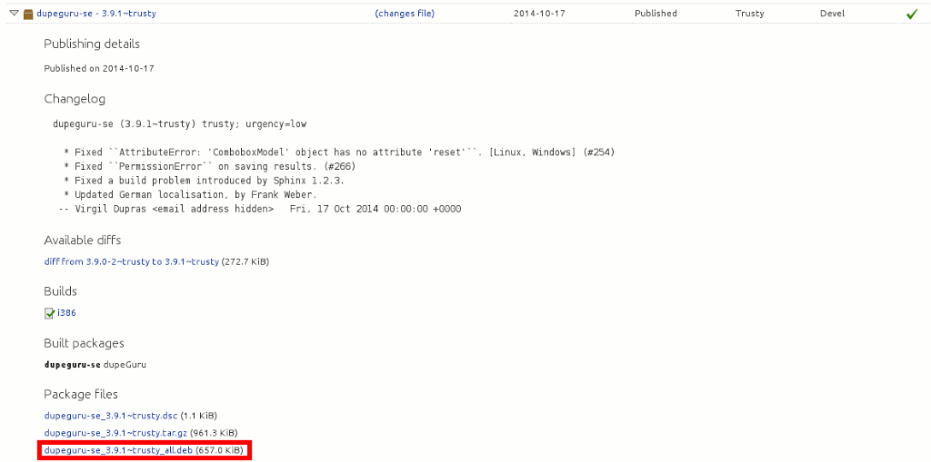 2.- Se abrirá una página donde encontrarás todos los paquetes, busca el de nombre dupeguru-se, seguido de la versión y el nombre de la versión de Ubuntu, por ejemplo, para descargar el archivo para Ubuntu 14.04, el archivo sería