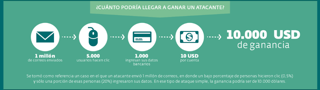 Los ataques de Phishing son realmente baratos de realizar, y pueden dejar grandes ingresos a los atacantes aún con un porcentaje de éxito mínimo, como puedes ver en la siguiente imagen:
